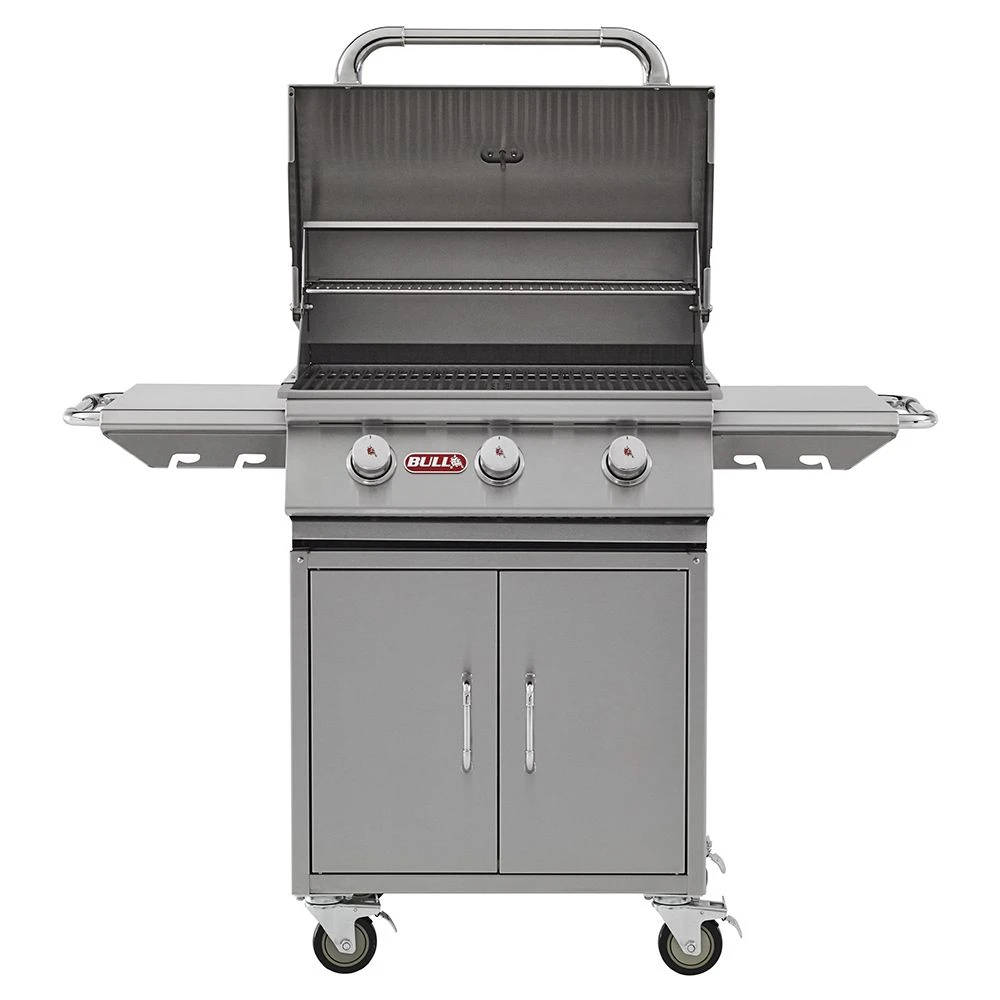 Bull BG-6910x Steer Premium 24-Inch Grill on Cart offers a high performance freestanding grilling machine that combines quality and affordability unlike most others. Bull’s 24-inch Steer BBQ grill boasts 304, 14-gauge stainless steel construction with 3 heavy-duty 15,000 BTU (45,000 BTU total) stainless steel burners for high-performance grilling while the thick stainless steel grates offer high surface area to create the professional style sear marks everyone desires. Bull BBQ’s ReliaBull Technology helps make the most of your grill space and has improved heat distribution by 150% with the help of the Bull flame tamers. The main grilling area combined with an included warming rack provides 556 total square inches of cooking space to ensure enough food space for the entire family while the dual lined grill hood guarantees a flavor lock and great heat retention during cooking. The durable zinc control knobs offer easy flame adjustment while the ultra-reliable piezo ignition offers the simplest of push-and-turn grill startups. The Steer grill cart provides plenty of space for a propane tank and other grilling accessories you may need. The 2 stainless steel side shelves offer areas for food prep while the 4 heavy-duty casters make it much easier to move your grill from one place to another. Do yourself a favor and reward yourself this grilling season with a superior grill station from Bull BBQ.