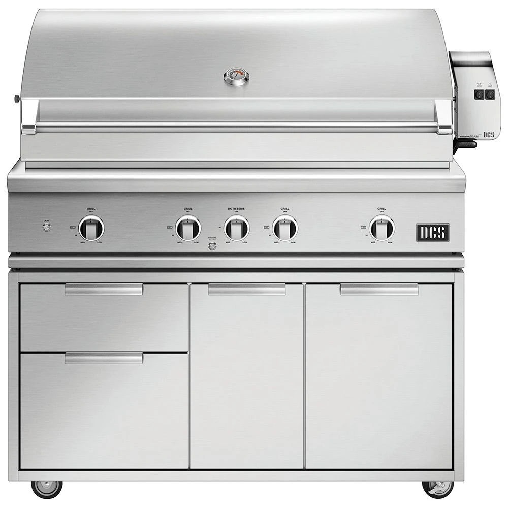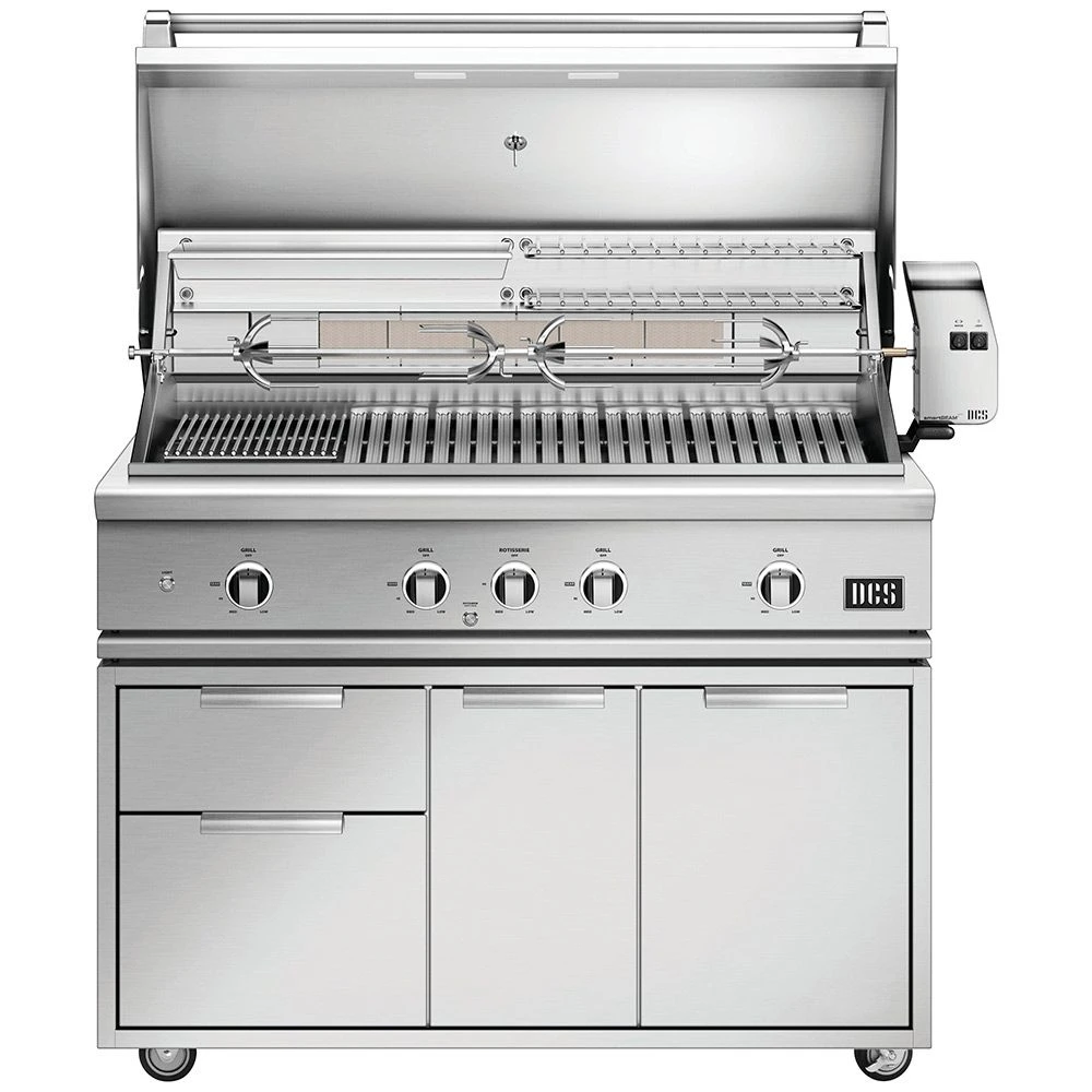 DCS BE1-48RC Series 9 48-Inch Freestanding Gas Grill with Rotisserie offers one of the most advanced BBQ grills on the market featuring a superior design and high end quality for unparalleled cooking performance. This grill features a complete 304 stainless steel construction to provide maximum durability designed to withstand the rigors of the outdoors. The double sided cast stainless steel grill grates feature one side with a gentle radius for handling delicate foods while the other side features a W shape for perfect sear lines and the dual position settings allow a flat or angled grill surface for a versatile grilling experience. In the angled setting, the patented Grease Management Systemâ„¢ channels grease and oils away from the flames to prevent flare ups and simplify the cleaning process.