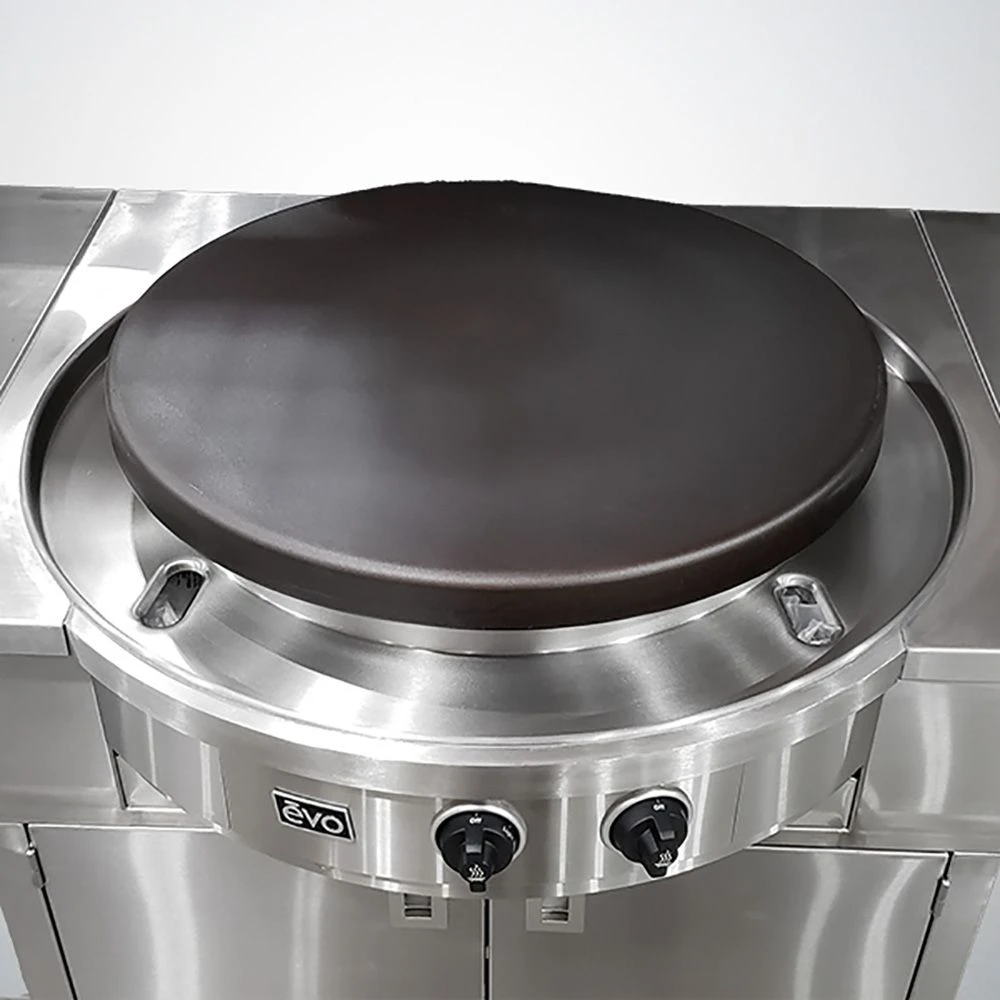 Evo 10-0055-10-0053-30 Affinity 30G Series Flat Top Gas Grill on Cart provides a unique grilling machine designed to enhance your patio & BBQ experience. Featuring heavy duty stainless steel construction, an oil-seasoned steel cooktop, and inner and outer tube burners, every inch of this grill expresses premium quality and manufacturing. With its distinctive design, this Evo grill allows foods to be prepared directly on the cooktop, and either separately or simultaneously, pots and pans may be used the same way as a more traditional cooking surface. The 30-inch diameter surface of this grill offers 706 square inches of cooking space and edge-to-edge even surface temperatures ranging from 225 degrees Fahrenheit to 525 degrees Fahrenheit to suit a wide variety of cooking styles.