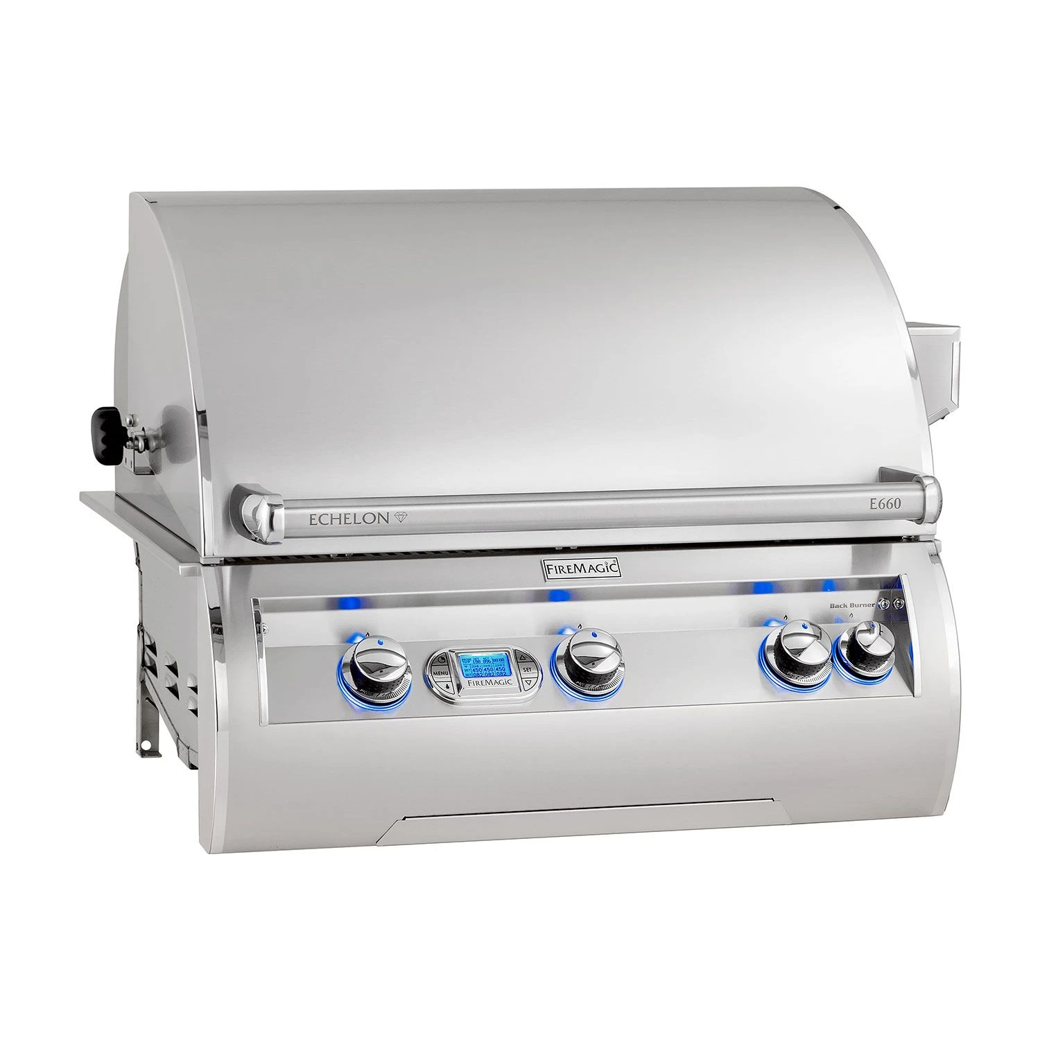 Fire Magic E660i Echelon Diamond Built-In Gas Grill provides the ultimate high end grill that’s crafted for cooking versatility, durability and longevity – truly a grill of masterful design and engineering. The complete 304 stainless steel construction is highlighted by cast stainless steel “E” burners capable of up to 26,000 BTU each. Fire Magic’s Diamond Sear Cooking Grids provide optimal heat transfer while the 16 gauge stainless steel flavor grids are specially designed to provide even heat distribution preventing hot and cold zones and protect the burners from grease and drippings. The large 660in² grilling surface offers plenty of grilling area while the Quantum rotisserie back burner is rated for 11,000 BTU and includes the heavy duty rotisserie kit for professional style cooking. The double walled, spring assisted grill hood features an ergonomic design with a 12″ firebox to offer complete convection cooking that’s topped off with a charcoal/smoker basket for more flavor options.