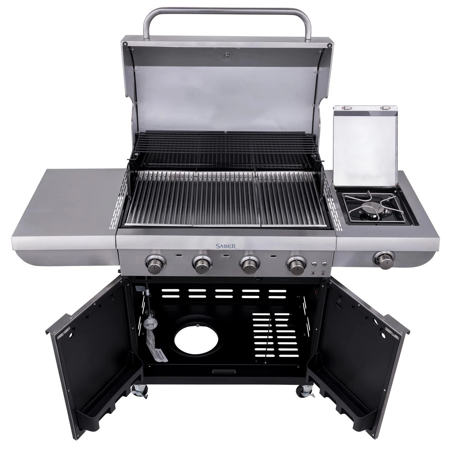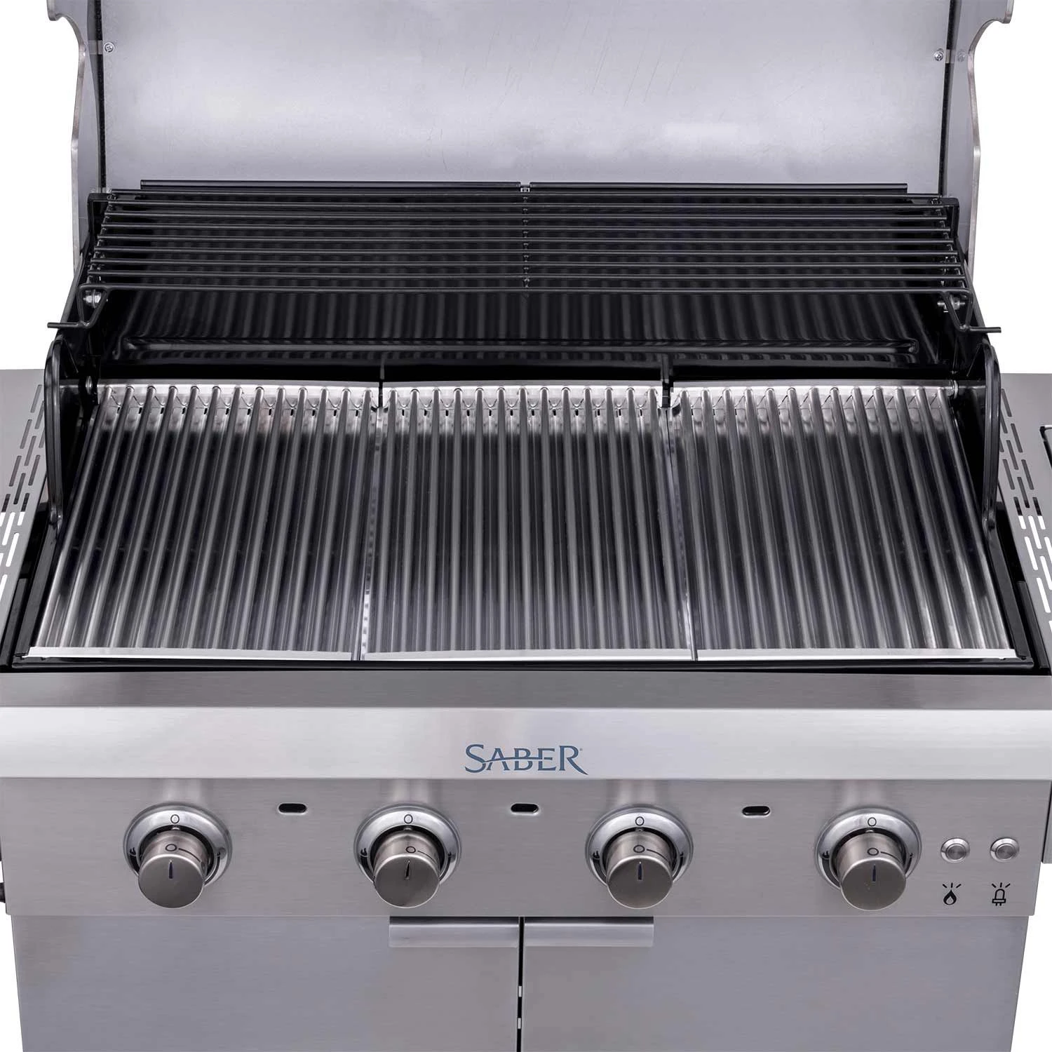 Saber R52SC0421 4-Burner Select Freestanding Infrared Grill with Side Burner, 40-Inches provides a premium addition to your outdoor kitchen. This grill brings restaurant quality results to your home with its patented Saber Cooking System. This innovative burner design heats evenly, eliminates flare-ups, and uses up to 30 percent less gas than comparable burners. This grill also offers a wider temperature range than traditional grills–from high temperature searing to low and slow roasting and everything in between. The Saber infrared can also pre-heat to searing temperatures in only 12 minutes to reduce the time it takes to get your food from grill to plate. When you’re finished grilling, the easy-to-clean design of the Saber grill allows food drippings to be burned off and brushed away with ease to save you even more time.