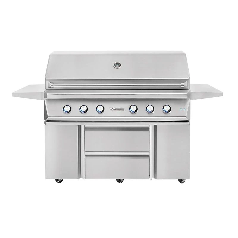Twin Eagles TEBQ54-C 54-Inch Gas Grill On Cart With Drawers And Door provides a high end grill with unmatched luxury and design. The premium 304 stainless steel construction ensures a long lasting and quality product, while the high attention to detail presents a uniquely crafted grill that’s as sleek as it is durable. The 1,000-square-inch grilling surface features (6) heavy duty grill burners that provide a total of 150,000 BTU capability. The beautiful grill base matches the grill head and accessories and features (2) soft closing doors, (2) self-latching drawers, heavy duty casters with front breaks, and fold down side shelves with tool holders. With optional additions, such as the infrared sear zone and infrared rotisserie, this grill exemplifies the ultimate combination of form and function–a true high performance BBQ grill.
